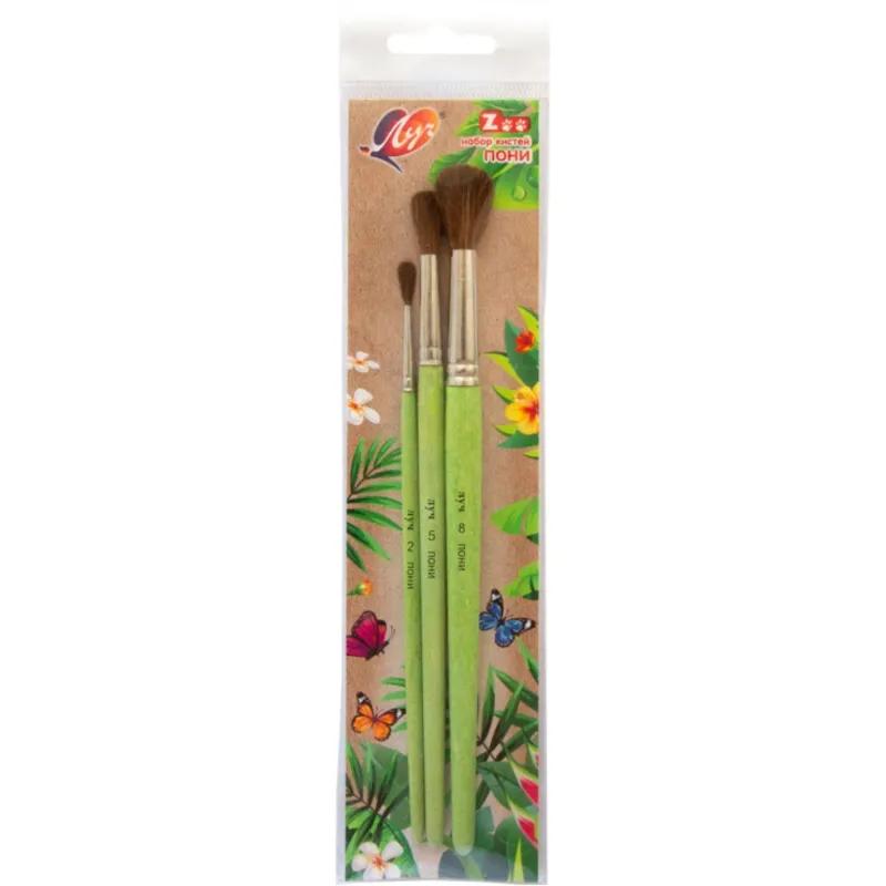 Набор кистей Луч Zoo пони (3 штуки в наборе)<br><br>Набор кистей предназначен для рисования акварелью, гуашью, темперой и акрилом. Мягкий и упругий пучок из натурального волоса пони хорошо впитывает краску и равномерно распределяет её по поверхности. Кисти подходят для закрашивания фона, создания плавных переходов и прорисовки тонких деталей. Каждая кисть оснащена круглым пучком, формируемым вручную, и металлической обоймой, которая надёжно соединяет части изделия. Деревянная ручка тщательно отшлифована и обработана безопасным зелёным покрытием, благодаря чему кисть удобно лежит в руке. В комплект входят кисти № 2, 5 и 8.
