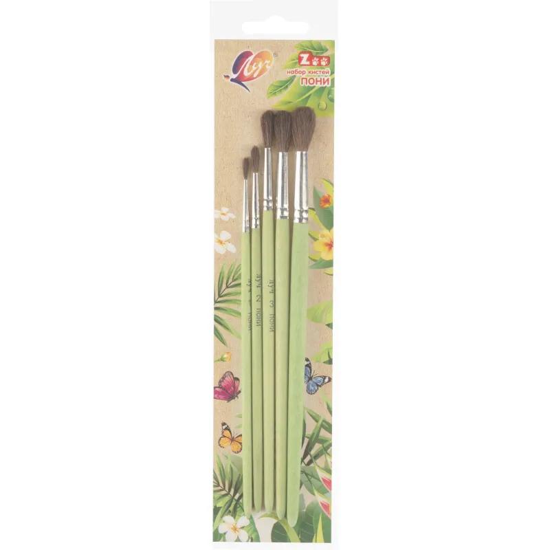 <br><br>Набор кистей Луч Zoo пони (5 штук в наборе)<br><br>Набор кистей предназначен для работы с акварелью, гуашью, темперой и акрилом. Волос пони в основании пучка хорошо впитывает краску и равномерно распределяет её по бумаге, позволяя наносить как тонкие линии, так и сплошные заливки. Кисти собираются вручную, имеют круглую форму и прочное соединение с деревянной ручкой благодаря металлической обойме с двойной обичайкой. Зелёная ручка из натурального дерева гладко отшлифована и покрыта безопасным составом, обеспечивающим комфорт при длительной работе. В комплект входят кисти № 1, 2, 3, 4 и 5.