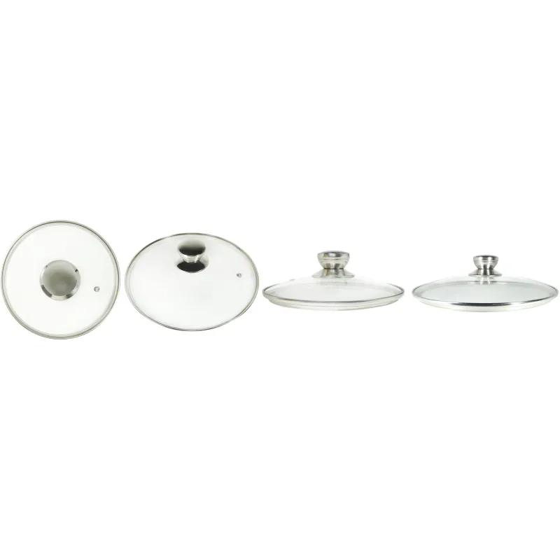 Крышка для посуды Panairo Chrome с металлическим ободком диаметр 16-20-22-24 см <br><br>Набор крышек состоит из четырёх предметов различных размеров и предназначен для использования с кастрюлями и ковшами. Крышки обеспечивают герметичное закрытие ёмкостей, что помогает сохранять тепло и защищать содержимое от внешних воздействий. Благодаря универсальным размерам этот набор станет незаменимым помощником на любой кухне.<br><br>Основные преимущества данного набора: <br>1. Размеры крышек: 16 см, 20 см, 22 см и 24 см. <br>2. Материал крышек отличается высокой прочностью и долговечностью. <br>3. Удобство в использовании и лёгкость в уходе делают этот набор практичным решением для повседневного использования. <br><br>Стеклянные крышки отличаются высоким качеством. Они снабжены устойчивой к износу ручкой из нержавеющей стали, которую удобно и приятно держать в руке. Для правильной циркуляции воздуха есть паровыпускное отверстие. Крышки дополнены ободом из нержавеющей стали. Легко моются, не впитывают запахи. Можно мыть в посудомоечной машине. Стеклянные крышки Panairo «Chrome» совместимы со всеми коллекциями посуды Panairo. <br><br>Перед первым использованием удалить все этикетки и упаковочные материалы, тщательно вымыть крышку тёплой мыльной водой и тщательно ополоснуть. Не подвергать горячую крышку резкому охлаждению, недопустимо скольжение крышки по рабочей поверхности плиты и стола. Во избежание царапин, ставьте крышку только на чистую поверхность.