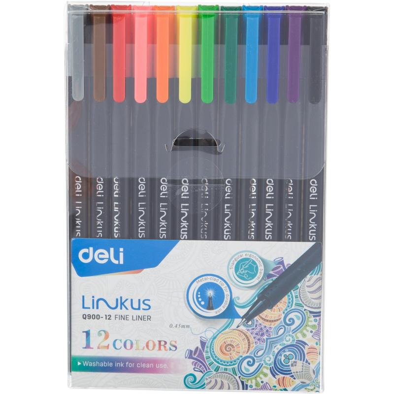 Яркий набор линеров Deli Linkus. Ручки с игловидным пишущим наконечником обеспечивают необыкновенно мягкое и четкое письмо на любой бумаге. Можно писать мелким шрифтом, закрашивать сложные детали, работать с линейками и трафаретами. Эргономичная форма изделия делает творческий процесс удобным для всех. Ваша рука не будет напрягаться. Долгое время сохраняют работоспособность без колпачка. Пигментные чернила на водной основе не имеют запаха, легко смываются с рук и отстирываются с ткани. Цвет колпачка соответствует цвету чернил. Поставляются в пластиковой упаковке.<BR>В наборе: 12 цветов. <BR>Цвет корпуса: черный.<BR>Диаметр пишущего узла: 0.45 мм.