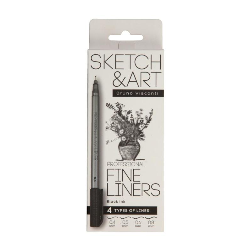 Набор линеров (капиллярных ручек) Sketch&Art чёрные толщина линии 0.4/0.5/0.6/0.8 мм (4 штуки в упаковке)<br> <br> Набор включает 4 линера черного цвета с толщиной линии 0.4 мм, 0.5 мм, 0.6 мм и 0.8 мм. Подходит для начинающих и опытных пользователей при создании набросков, письма и чертёжных работ.<br> <br> Пигментные чернила на водной основе устойчивы к выгоранию, воздействию воды и спиртосодержащих средств. Круглый пластиковый корпус серого цвета с плотно закрывающимся колпачком предотвращает высыхание чернил. Игольчатые наконечники из синтетического волокна обеспечивают четкие линии.<br> <br> Комплект упакован в картонную коробку с пластиковым ложементом, где каждый линер имеет отдельное место для хранения.