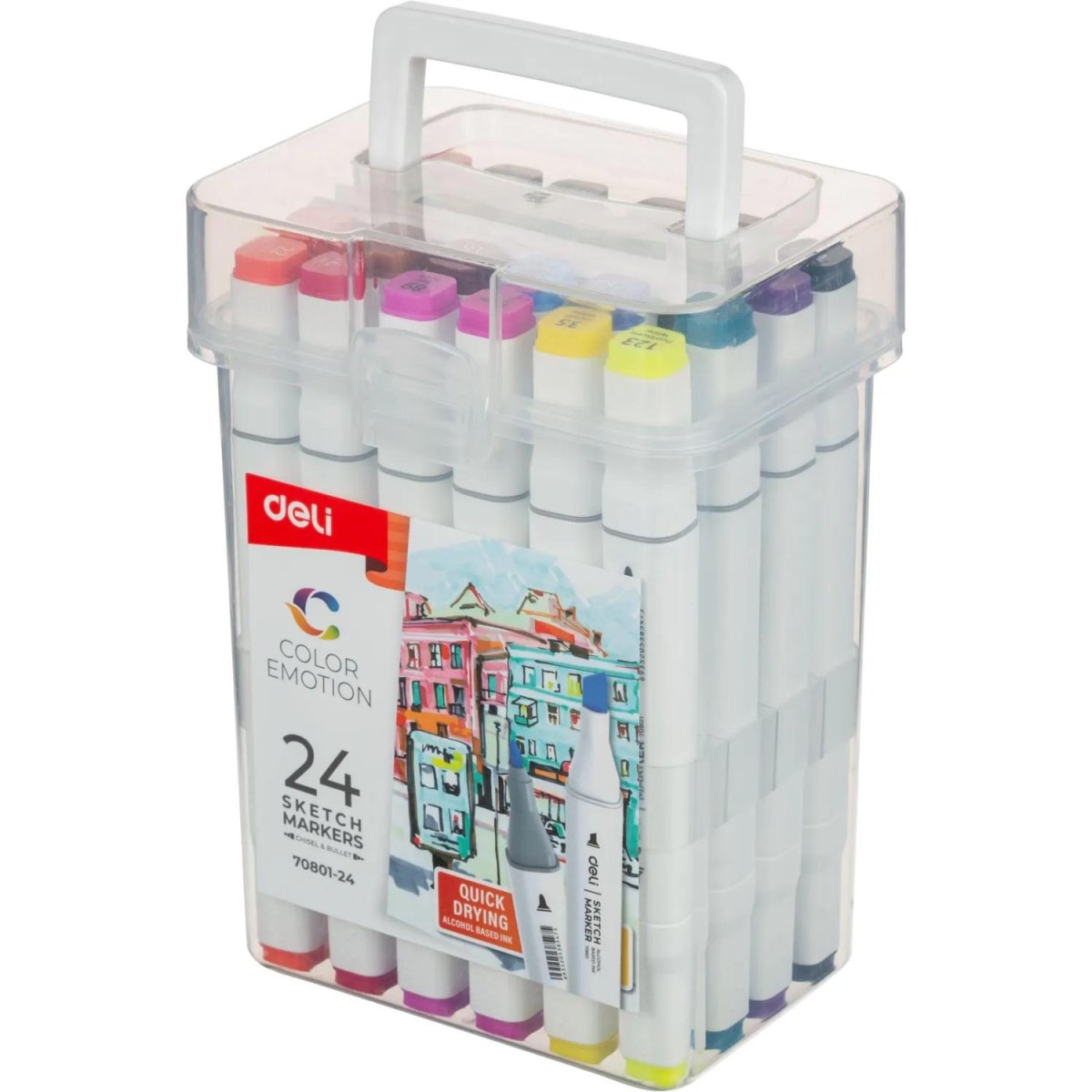 Набор маркеров для скетчинга Deli E70801-24 двухсторонние 24 цвета (толщина линии 1-6 мм)<br> <br> Набор двусторонних профессиональных маркеров для скетчинга Deli предназначен для эскизов, скетчинга, иллюстрации, арт-дизайна, детских рисунков и т. д. Подходит для рисования на бумаге разной плотности и на картоне. <br> Прочные и долговечные наконечники: с одной стороны тонкий круглый 1 мм — для детальных элементов или окантовки, а с другой — скошенный широкий 6 мм, предназначенный для больших площадей. Превосходный эффект наложения цветов, ровный и гладкий. Чернила спиртовые, быстросохнущие, водостойкие, не растекаются под каплями воды, стойкие к выгоранию и сохраняющие яркие краски. Нетоксичные и без кислоты.<br> Портативный пластиковый бокс предназначен для удобного хранения и переноски. После использования маркеры следует хранить закрытыми в прохладном помещении, вдали от источников тепла. В наборе 24 цвета.