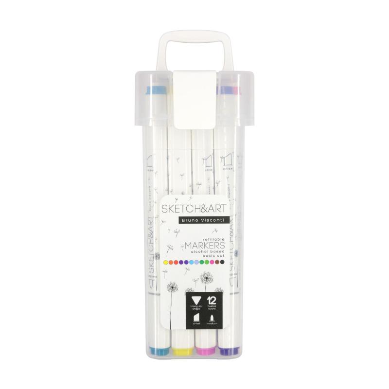 Набор маркеров для скетчинга Sketch&Art Базовый двухсторонние 12 цветов (толщина линии 1-5 мм)<br> <br> Высококачественные профессиональные маркеры Sketch&Art предназначены для рисования, набросков, дизайнерских работ. В наборе 12 базовых цветов. Эргономичный трёхгранный корпус из полипропилена — лёгкий и ударопрочный. Плотно защёлкивающиеся колпачки обеспечивают долгую сохранность чернил от высыхания, а рельефное нанесение в форме точек на их поверхность предотвращает скольжение руки при открывании. Маркер имеет два наконечника из износостойкого волокна — пулевидный с шириной линии 1 мм и скошенный, позволяющий варьировать ширину линии от 1 до 5 мм. Перманентные чернила на спиртовой основе не токсичны и быстро сохнут на поверхности, оставляя яркий след. Возможность многократно заправлять чернилами маркер значительно продлевает срок его службы. Маркеры хорошо ложатся на бумагу разной фактуры и плотности. Более гладкая бумага даёт больше простора для смешения цветов и создания градиентов. Также этот художественный материал можно использовать для создания рисунков и на стекле, и на светлом пластике, предварительно обезжирив их поверхность. Стойкость и яркость цвета гарантированы. Следы от маркеров легко отстирываются и отмываются с помощью моющих средств. Маркеры упакованы в пластиковый пенал с ручкой — их удобно хранить и транспортировать.<br> Цвета в наборе: оранжевый, коричневый, винный, тёмно-коричневый, сине-зелёный, зелёный, светло-зелёный, болотный, древесный, оливковый, серый, коричнево-жёлтый.