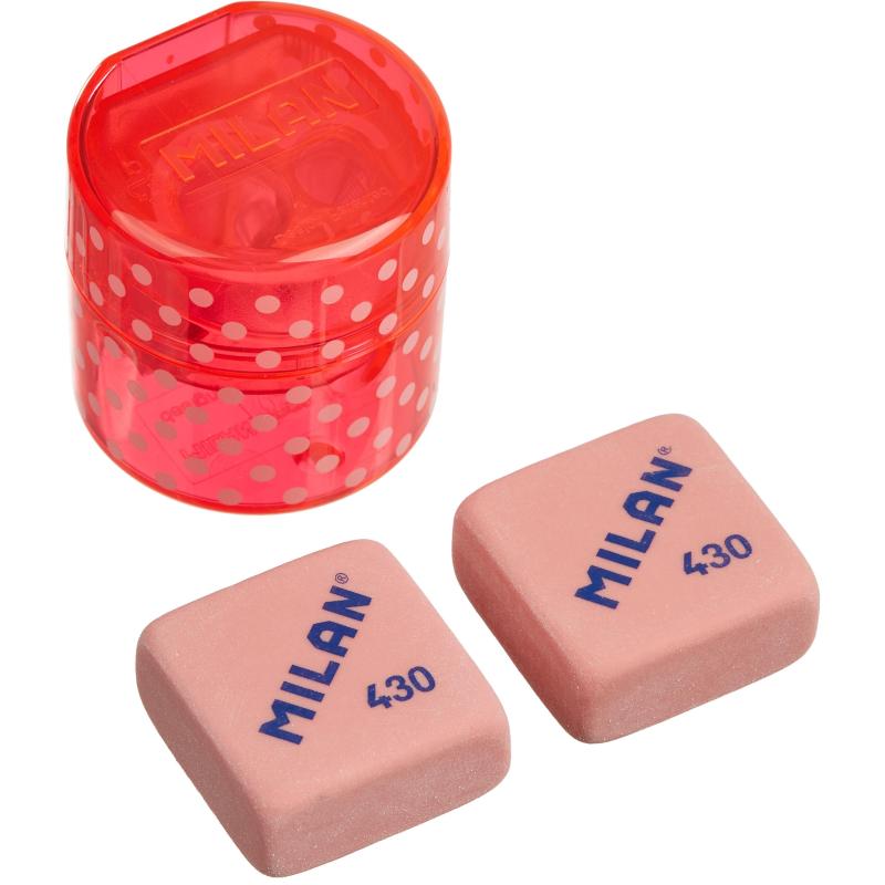 <p>Набор красная прозрачная двойная точилка для карандашей (одна стандартная точилка и одна точилка Maxi) с контейнером и 2 мягких ластика из каучука. Точилка для карандашей имеет острое и прочное лезвие из углеродистой стали, что делает его идеальным для всех видов карандашей. Он также имеет систему безопасных лезвий, которая предотвращает отсоединение лезвия от корпуса точилки для карандашей. Разработано в Испании собственным отделом исследований и разработок Milan. Поставляется в блистере с европодвесом.</p>
