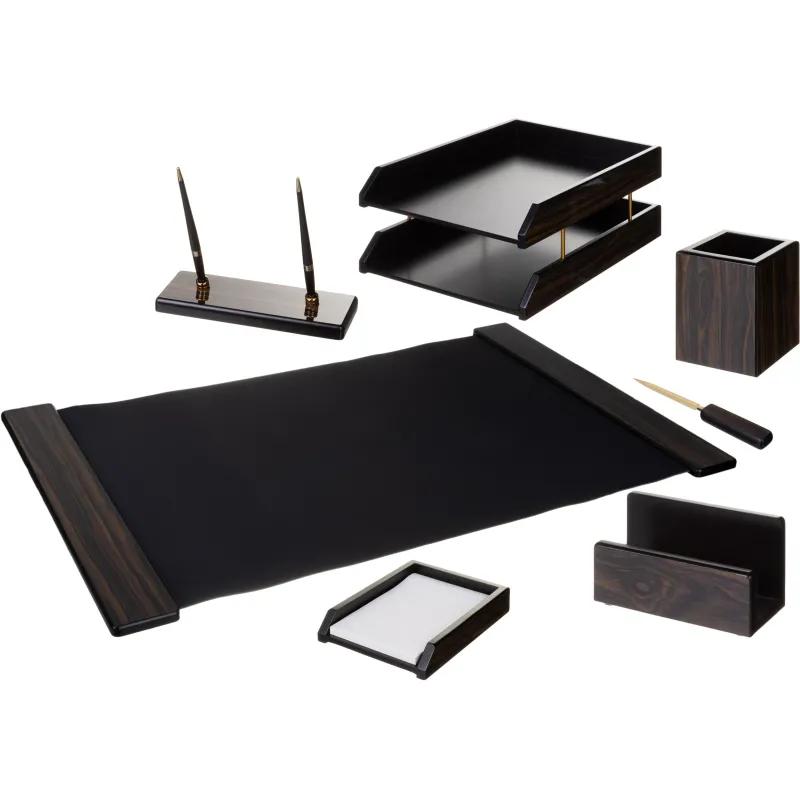 Набор настольный MDF 7FE-5A МДФ чёрное дерево (7 предметов)<br><br>Настольный набор 7FE-5A выполнен из МДФ с отделкой под чёрное дерево. Включает 7 предметов для организации рабочего пространства. Подходит для офиса и дома.<br><br>Комплектация: коврик настольный (МДФ, ПВХ), подставка-держатель для ручек (МДФ, пластик), подставка для бумаг для заметок (МДФ), подставка для писем (МДФ), подставка для ручек и карандашей (МДФ), ножичек канцелярский для вскрытия конвертов (МДФ, металл), лоток для бумаг двухъярусный (МДФ, металл), ручка шариковая (2 штуки).<br><br>Упакован в картонную коробку. Набор внутри упакован в слюду. Цвет: чёрное дерево. Основной материал: МДФ. Шариковые ручки входят в набор.