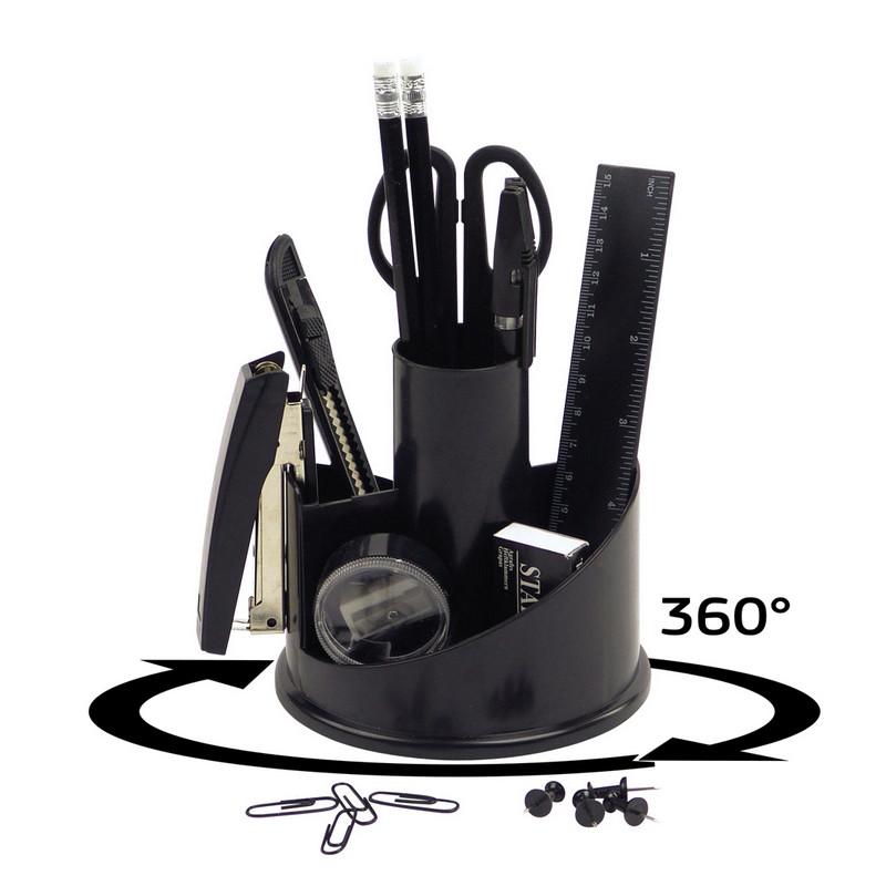 Настольный канцелярский набор Attache выполнен из пластика в черном цвете с прозрачными вставками.<br><br>Отличное решение для рабочего стола. Подставка занимает минимум места и вмещает в себя все нужны канцелярские мелочи для работы.<br><br>Комплектуется: ножницами, двумя карандашами с ластиком, канцелярским ножом, двумя шариковыми ручками, ластиком, линейкой, скобами для степлера № 10, точилкой, степлером № 10, силовыми кнопками, скрепками и подставкой. Всего 14 предметов.