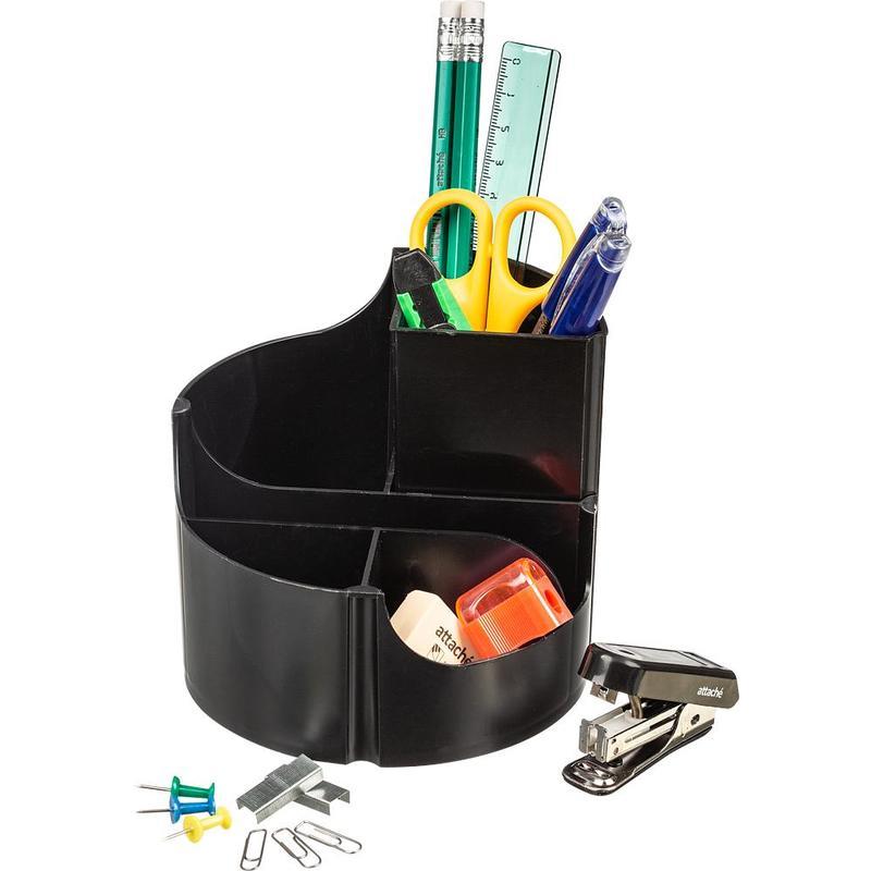 Настольный канцелярский набор Attache выполнен из пластика в черном цвете с прозрачными вставками.<BR><BR>Отличное решение для рабочего стола. Подставка занимает минимум места и вмещает в себя все нужны канцелярские мелочи для работы. Имеет вращающуюся на 360 градусов основу.<BR><BR>Комплектация:<BR>две шариковые ручки, два карандаша с ластиком, нож канцелярский, точилка, ластик, ножницы, линейка, степлер, скобы (номер 10), скрепки, кнопки и подставку. Поставляется в термоусадочной пленке. Всего 14 предметов.