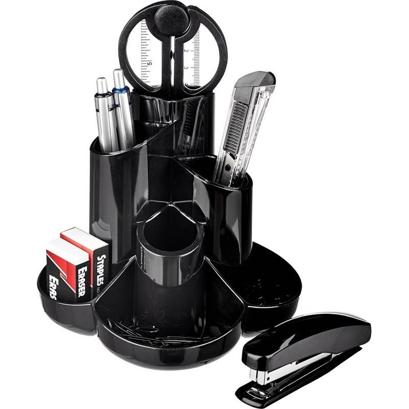 Настольный канцелярский набор Attache Selection выполнен из пластика в черном цвете.<br><br>Отличное решение для рабочего стола. Подставка занимает минимум места и вмещает в себя все нужны канцелярские мелочи для работы.<br><br>Комплектация:<br>подставка, ножницы, линейка, степлер, скобы, нож, ластик, скрепки, механический карандаш, автоматическая шариковая ручка. Всего 10 предметов. Поставляется в картонной коробке.