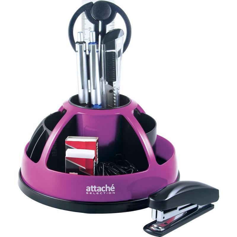 Настольный канцелярский набор Attache Selection выполнен из пластика в фиолетовом цвете.<br><br>Отличное решение для рабочего стола. Подставка занимает минимум места и вмещает в себя все нужны канцелярские мелочи для работы. Имеет вращающуюся на 360 градусов основу.<br><br>Комплектация:<br>подставка, ножницы, линейка, степлер № 10, скобы, нож, ластик, скрепки, механический карандаш, автоматическая шариковая ручка. Всего 10 предметов. Поставляется в картонной коробке.