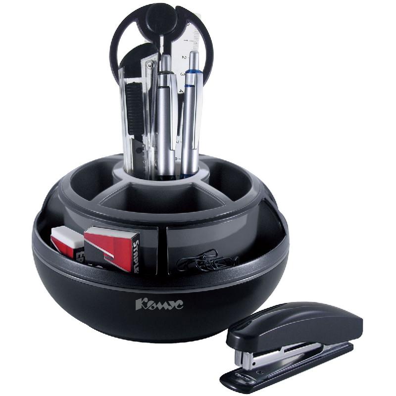 Настольный канцелярский набор Комус выполнен из пластика в <nobr>черно-сером</nobr> цвете.<br><br>Отличное решение для рабочего стола. Подставка занимает минимум места и вмещает в себя все нужны канцелярские мелочи для работы. Имеет вращающуюся на 360 градусов основу.<br><br>Комплектация:<br>подставка, ножницы, линейка, степлер № 10, скобы, нож, ластик, скрепки, механический карандаш (диаметр грифеля 0.7 мм), автоматическая шариковая ручка. Всего 10 предметов. Поставляется в картонной коробке.