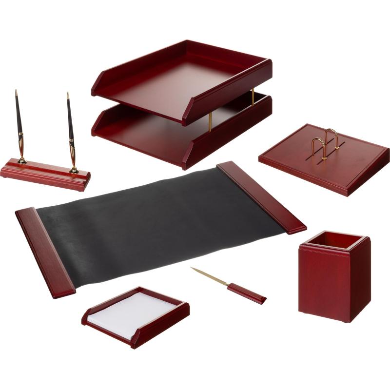 Набор настольный M7C-7A деревянный красное дерево (7 предметов)<br><br>Настольный набор M7C-7A выполнен из натурального дерева. Включает 7 предметов для организации рабочего пространства. Подходит для офиса и дома. <br><br>Комплектация: коврик настольный (дерево, ПВХ), подставка-держатель для ручек (дерево, металл, пластик), подставка для бумаг для заметок (дерево), нож канцелярский для вскрытия конвертов (дерево, металл), подставка для календаря (дерево, металл), лоток для бумаг двухъярусный (дерево, металл), подставка для ручек и карандашей (дерево), ручка шариковая (2 штуки). <br><br>Упакован в картонную коробку. Набор внутри упакован в слюду. Цвет: красное дерево. Основной материал: красное дерево. Шариковые ручки входят в набор.