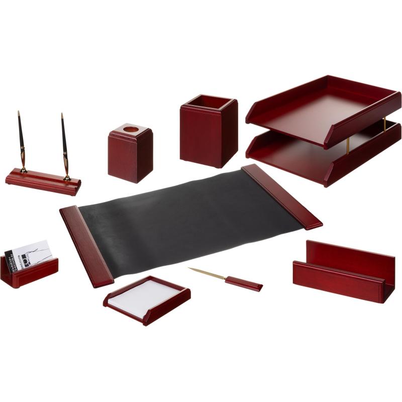 Набор настольный M9C-25A деревянный красное дерево (9 предметов)<br><br>Настольный набор M9C-25A выполнен из натурального дерева. Включает 9 предметов для организации рабочего пространства. Подходит для офиса и дома. <br><br>Комплектация: коврик настольный (дерево, ПВХ), подставка-держатель для ручек (дерево, металл, пластик), подставка для бумаг для заметок (дерево), подставка для визиток (дерево), подставка для ручек и карандашей (дерево), нож канцелярский для вскрытия конвертов (дерево, металл), подставка для писем (дерево), держатель-зажим (дерево), лоток для бумаг двухъярусный (дерево, металл), ручка шариковая (2 штуки).<br><br>Упакован в картонную коробку. Набор внутри упакован в слюду. Цвет: красное дерево. Основной материал: красное дерево. Шариковые ручки входят в набор.