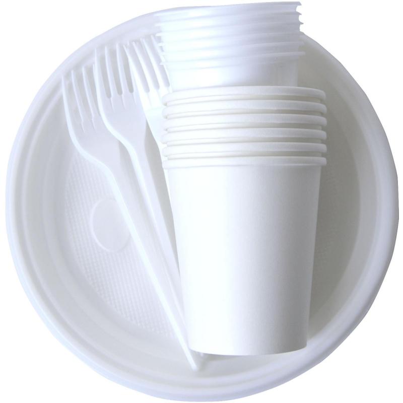 Набор одноразовой посуды на 6 персон (24 предмета). <br>Набор одноразовый посуды № 2 подходит как для холодных, так и для горячих блюд. Максимальная температура используемых пищевых продуктов 70 °С. Пригодится для отдыха на природе, а также корпоративных мероприятий. <br>В набор входят: <br>1. Тарелка белая диаметром 205 мм — 6 штук. <br>2. Стакан белый 200 мл — 6 штук. <br>3. Стакан бумажный 250 мл — 6 шт. <br>4. Вилка белая — 6 штук. <br>Изделия готовы к применению без предварительного промывания водой, не подходят для разогрева еды в микроволновой печи. <br>Набор изготовлен из качественного полипропилена (PP5) и полистирола (PS6). <br>Каждый набор находится в индивидуальной упаковке с удобной перфорацией для вскрытия пакета.<br><br>Внимание! Товар поставляется в транспортном коробе (короба могут отличаться по форме и размеру).