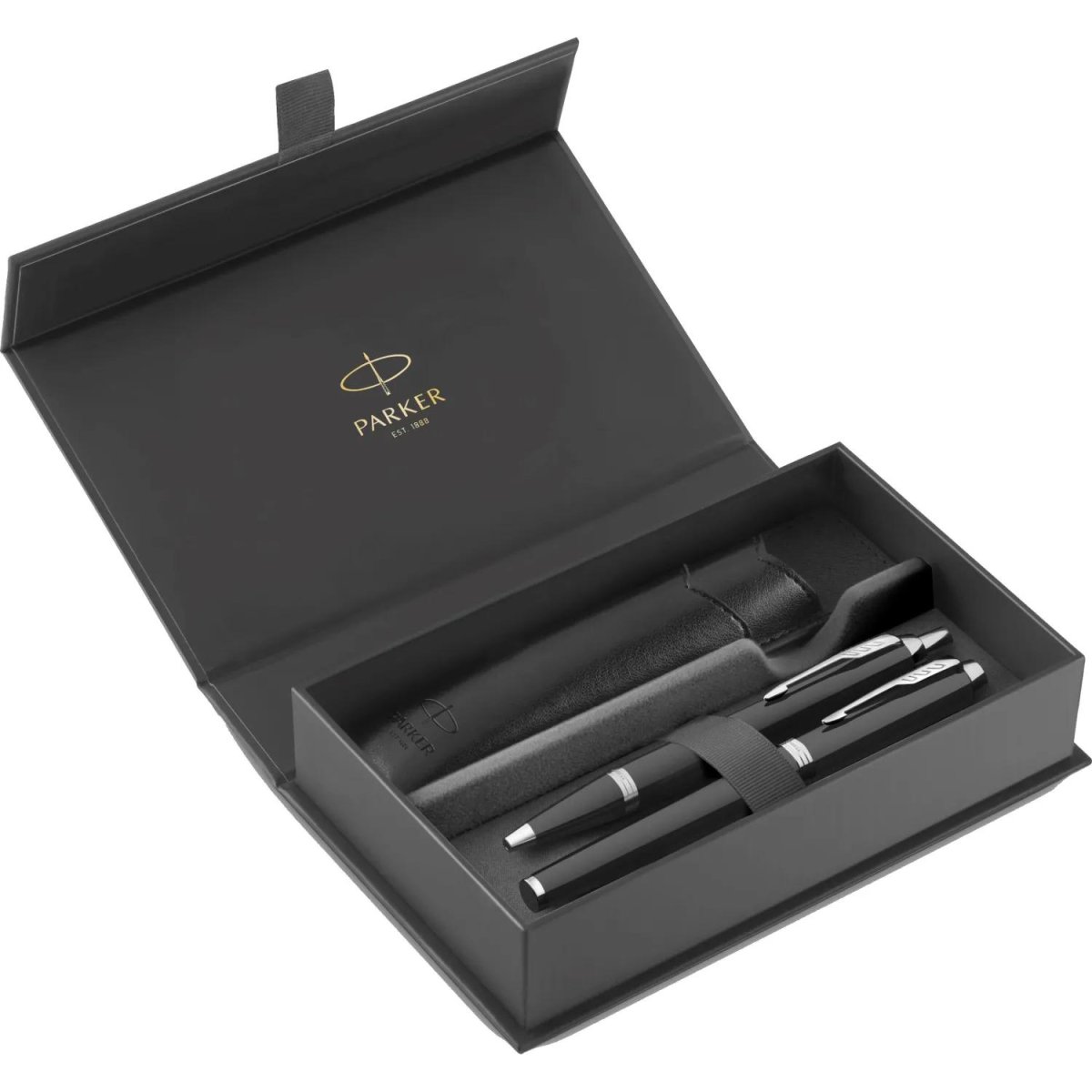 Набор пишущих принадлежностей включает шариковую и перьевую ручки Parker IM Black CT, дополненный футляр. Комплект подходит для ежедневной работы с документами и деловой переписки. Корпус обеих ручек выполнен из латуни с чёрным лаковым покрытием и отделкой из нержавеющей стали. Шариковая ручка оснащена кнопочным механизмом и стержнем синего цвета, толщина линии письма составляет 0.8 мм при диаметре шарика 1 мм. В перьевой ручке используется стандартный перьевой наконечник и синий картридж. Конструкция ручек допускает замену стержня и подходит под персонализацию. Футляр размером 109×39×170 мм помогает аккуратно хранить набор и защищает принадлежности при переноске. Изделия относятся к серии IM.