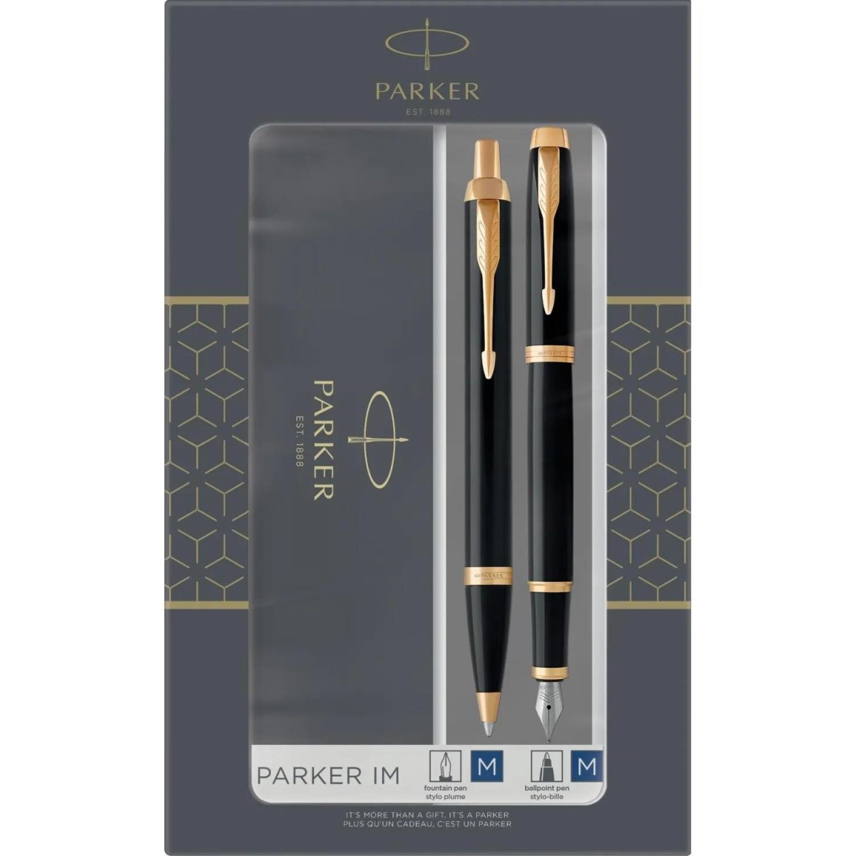 Набор пишущих принадлежностей включает шариковую и перьевую ручки Parker IM Black GT. Обе ручки предназначены для повседневного письма и деловой переписки. Корпус выполнен из латуни с чёрным лаковым покрытием, детали оформлены нержавеющей сталью с гальваническим золотым напылением. Шариковая ручка оснащена кнопочным механизмом и стержнем синего цвета; толщина линии письма составляет 0.8 мм при диаметре шарика 1 мм. Перьевая ручка имеет стандартный наконечник и комплектуется синим картриджем. Конструкция позволяет менять стержень. Набор подходит под персонализацию. Серия — IM.