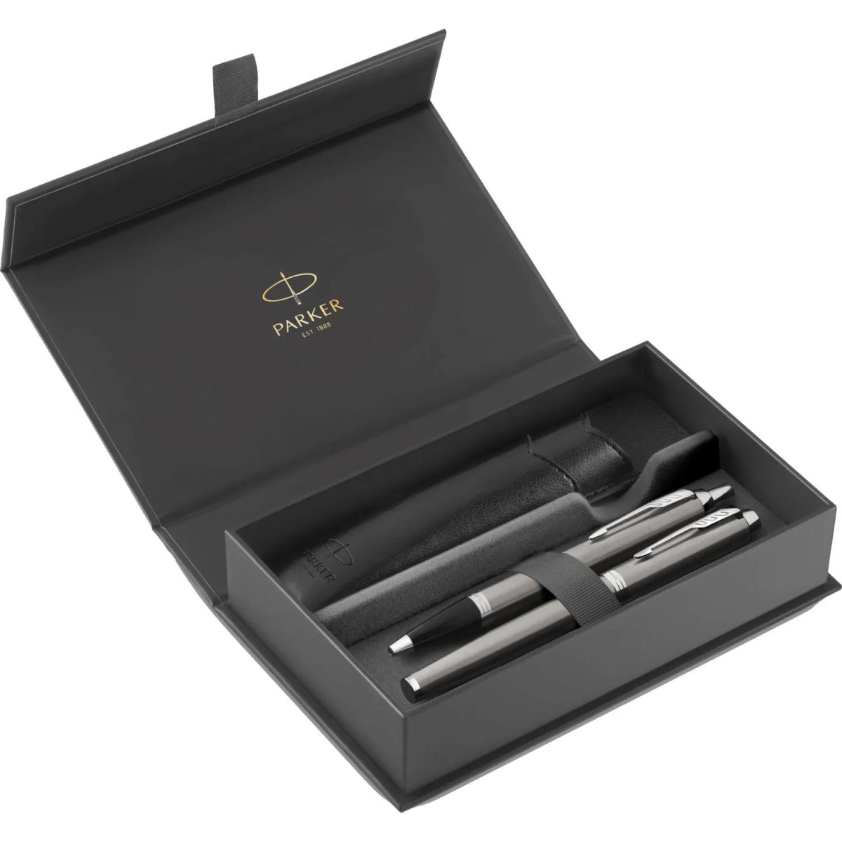 Набор пишущих принадлежностей включает шариковую и перьевую ручки Parker IM Stainless Steel CT, а также футляр. Комплект предназначен для повседневного письма и аккуратного хранения принадлежностей. Корпус обеих ручек выполнен из латуни с серым лаковым покрытием и хромированными деталями отделки из нержавеющей стали. Шариковая ручка оснащена кнопочным механизмом и стержнем синего цвета; толщина линии письма составляет 0.8 мм при диаметре шарика 1 мм. Перьевая ручка имеет стандартный наконечник и поставляется с синим картриджем. Конструкция ручек допускает замену стержня, модели подходят под персонализацию. Футляр защищает комплект при хранении и переноске. Серия — IM.