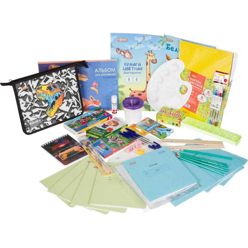 Набор первоклассника Комус Класс для мальчика 60 предметов<br><br>Набор первоклассника включает необходимые школьные принадлежности для учёбы и творческих занятий. Комплект упакован в текстильную папку с ручками и рассчитан на мальчиков. Папка изготовлена из полиэстера и имеет размер 350x60x250 мм. В набор входит 60 предметов, подходящих для детей от 6 лет.<br><br>В состав набора входит:<br>- альбом для рисования, 12 листов - 1 штука;<br>- бумага цветная, 8 цветов - 1 штука;<br>- картон цветной, 8 цветов - 1 штука;<br>- картон белый - 1 штука;<br>- карандаши цветные, 12 цветов - 1 набор;<br>- пластилин, 6 цветов - 1 набор;<br>- краски акварельные, 12 цветов - 1 набор;<br>- гуашь, 6 цветов - 1 набор;<br>- палитра - 1 штука;<br>- настольное покрытие для лепки А5 - 1 штука;<br>- папка-конверт на молнии 228x335 - 1 штука;<br>- тетрадь школьная, 12 листов в клетку - 5 штук;<br>- тетрадь школьная, 12 листов в косую линейку - 5 штук;<br>- тетрадь школьная, 12 листов в линейку - 5 штук;<br>- обложка для тетрадей - 10 штук;<br>- ножницы детские - 1 штука;<br>- пенал пластиковый - 1 штука;<br>- ручка шариковая синяя - 4 штуки;<br>- ручка шариковая четырёхцветная - 4 штуки;<br>- карандаш чернографитный - 5 штук;<br>- набор кистей - 1 набор;<br>- блокнот А6, 40 листов - 1 штука;<br>- ластик - 2 штуки;<br>- линейка 20 см - 2 штуки;<br>- точилка для карандашей - 1 штука;<br>- клей-карандаш - 1 штука;<br>- стакан-непроливайка - 1 штука.