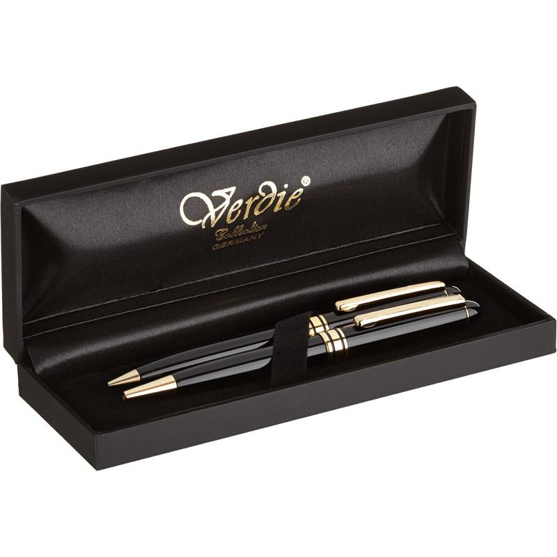 <p>Подарочный набор из коллекции Verdie отлично подойдет в качестве презента для коллеги в офисе, также в качестве корпоративного презента или на день рождения знакомому. В набор входит шариковая ручка и механический карандаш. Корпус ручки и карандаша изготовлен из стали с верхним покрытием из черной эмали, предметы декорированы отделкой ’’под золото’’. Толщина линии письма шариковой ручки — 0.5 мм. Цвет чернил — синий. Стержень меняется. Подходит стержень шариковый Attache тип Parker синий 98 мм (толщина линии 0.7 мм); Стержень шариковый ICO Silver тип Parker синий 98 мм (толщина линии 0.5 мм). Набор поставляется в подарочном деревянном футляре. Размер: 185×90×45 мм. Страна производства — Китай.</p>