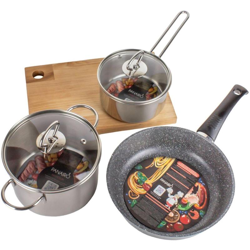 Набор посуды для приготовления Panairo CA-NAB-3 алюминий/нержавеющая сталь/дерево 6 предметов<br><br>Набор посуды Panairo предназначен для варки, жарки и тушения блюд дома. Подходит для газовых, электрических, стеклокерамических и комбинированных плит. Не совместим с индукционными плитами и духовкой.<br><br>Состав: ковш 1 л (высота борта 6 см), сковорода глубокая 22 см, кастрюля 2 л с крышкой, разделочная доска из массива берёзы 30×20×2 см. Толщина стенок — 3 мм, дна — 5 мм. Вес — 2 кг. Посуда из литого алюминия с мраморным антипригарным покрытием внутри, крышки стеклянные, ручки из бакелита. Доска деревянная.<br><br>Антипригарное покрытие сковороды предотвращает прилипание продуктов. Толстое дно обеспечивает равномерный нагрев. Корпус в серебристых и чёрных тонах выглядит стильно. Ковш удобен для соусов, сковорода — для жарки и тушения, кастрюля — для супов и рагу.<br><br>— перед первым использованием требуется тщательно промыть изделия;<br>— хранить изделия в чистом, сухом виде;<br>— не рекомендуется использовать губки с абразивным слоем;<br>— не рекомендуется промывка изделий в посудомоечной машине с использованием моющих средств, в состав которых входит активный кислород.