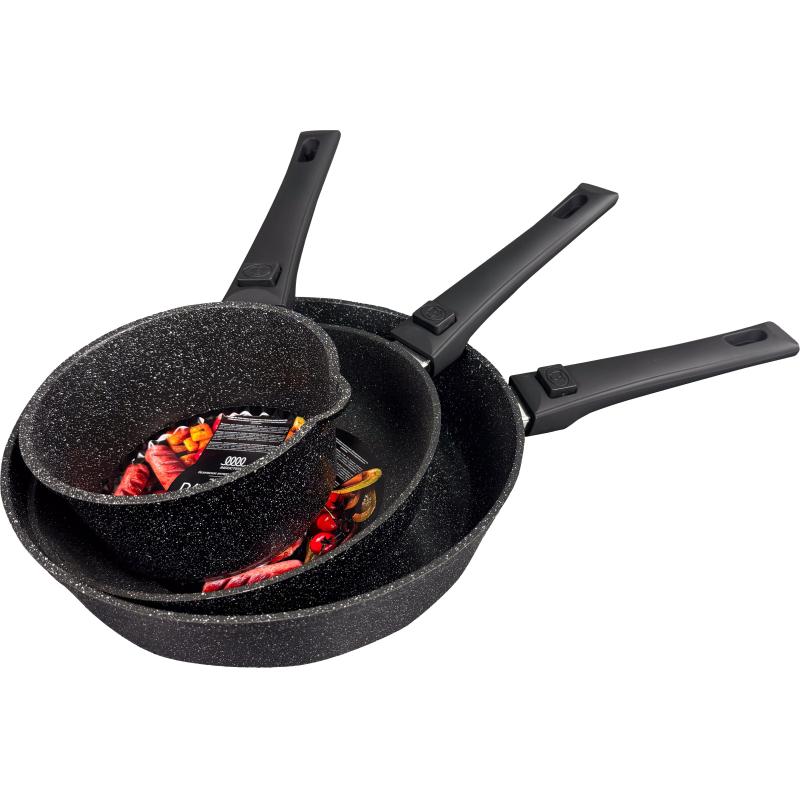 Набор посуды Panairo Soverdo induction — это практичный комплект, включающий все необходимое для повседневного приготовления пищи на индукционных, газовых и электрических плитах. В набор входят две сковороды диаметром 22 см и 28 см с ребристым дном для равномерного нагрева, идеально подходящие для жарки и приготовления блюд с минимальным количеством масла, а также ковш объёмом 1,4 литра для варки соусов, супов или гарниров. Все элементы оснащены съёмными ручками, что делает их удобными для хранения, использования в духовке и подачи блюд.<br>Комплект изготовлен из литого алюминия, устойчивого к царапинам и износу, что гарантирует долгий срок службы и комфорт при готовке. Этот набор станет отличным выбором для современной кухни. <br>Тип упаковки: картонная коробка. <br>Размер упаковки: 30×10×39 см.
