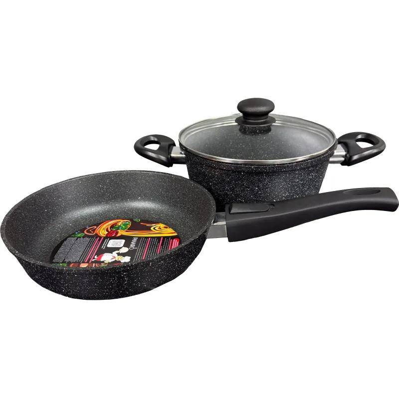 Набор посуды Panairo Veranss — это практичный и универсальный комплект, предназначенный для приготовления разнообразных блюд. В набор входит сковорода диаметром 22 см со съёмной ручкой, которая отлично подходит для жарки мяса, рыбы или овощей. Кастрюля объёмом 2 литра идеально подойдёт для варки супов, гарниров или тушения. Универсальная крышка диаметром 22 см совместима как со сковородой, так и с кастрюлей, что делает процесс готовки удобным и эффективным. <br>Комплект изготовлен из литого алюминия, устойчивого к царапинам и износу, что гарантирует долгий срок службы и комфорт при готовке. Этот набор станет отличным выбором для современной кухни. <br>Тип упаковки: картонная коробка. <br>Размер упаковки: 30×30×20 см.