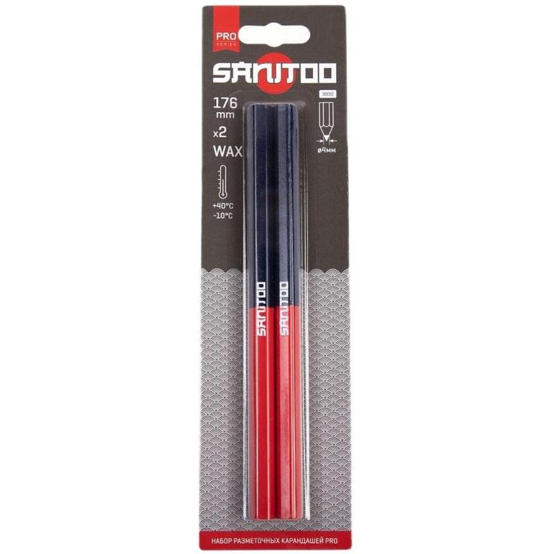 Набор карандашей разметочных Sanitoo Pro 176 мм незаточенных (2 штуки в упаковке). Разметочные двухсторонние карандаши предназначены для нанесения разметки при ремонтно-строительных работах. <br>Идеально подходят для разметки и маркировки по камню, бетону, кирпичу, сухому дереву, фанере, бумаге, гипсокартону, пластику и металлу.<br>Оставляет четкий яркий след на поверхности заготовки.<br>Карандаш длиной 176 мм с шестигранной формой сечения с грифелями красного и синего цвета.<br>Грифель диаметром 4.0 мм из композитного материала на основе воска, с добавлением цветового пигмента.<br>Рабочий диапазон температур −10°С — +40°С.<br>В наборе — 2 карандаша.<br>Упаковка — блистер кард.<br><br>Внешний вид и/или характеристики товара могут быть изменены производителем в соответствии с производственным процессом.