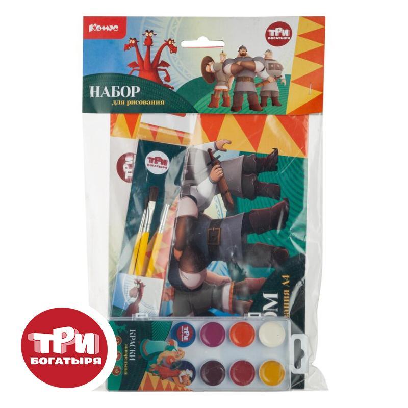 Набор школьный для рисования Комус Три Богатыря 5 предметов упакован в пакет ZIP-Lock, сверху оснащен картонным европодвесом с фигурным вырезом для возможности дальнейшего подвешивания на крючки и направляющие, установленные на торговых стендах и в прикассовой зоне. Включает ассортимент для реализации творческого воображения школьника. При этом дизайн всего ассортимента в составе набора представлен героями мультфильма «Три богатыря». Школьный набор включает 5 предметов: Альбом для рисования — 1 штука. Кисти для рисования — 3 штуки. Набор акварельных красок — 1 штука. Наполнение набора может меняться на соответствующее по составу и стоимости в зависимости от наличия товара на складе.