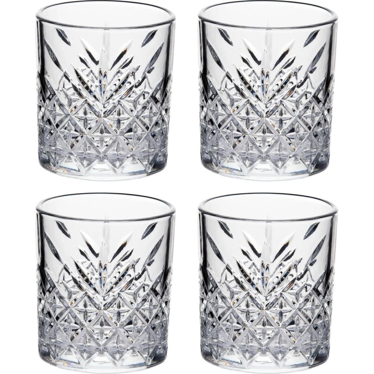 Набор стаканов (рокс) Pasabahce Таймлесс 345 мл (4 штуки в упаковке) <br><br>Набор стаканов из прозрачного стекла предназначен для подачи виски, бренди и других крепких напитков. Изделия выполнены в форме рокс, которая обеспечивает удобное удержание и гармонично сочетается с классической сервировкой. <br>Объём каждого стакана составляет 345 мл, высота — 8.5 см, диаметр — 7.2 см. Элегантная гравировка придаёт посуде изысканный вид и делает её оригинальным элементом стола. <br>Стаканы устойчивы к повреждениям и подходят для мытья в посудомоечной машине, однако не предназначены для использования в СВЧ-печи. <br>В набор входит 4 стакана.