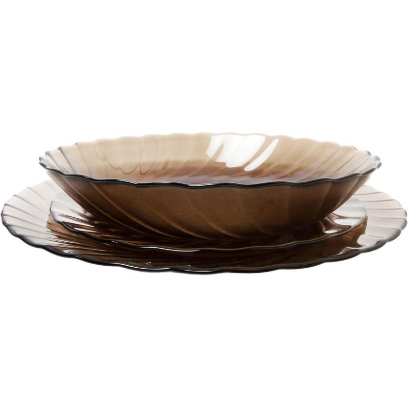 Набор столовой посуды «Океан Эклипс» на 6 персон из 18 предметов представляет собой качественный сервиз, предназначенный для повседневного и праздничного использования. Он идеально подходит для сервировки как домашнего стола, так и для мероприятий на свежем воздухе, таких как пикники или дачные выезды.<br> Посуда изготовлена из стекла высочайшего качества. Это обеспечивает долговечность, устойчивость к появлению сколов и царапин, а также не позволяет ей впитывать запахи. Стеклянные тарелки легко очищаются от остатков пищи.<br> Комплектация:<br> Тарелка десертная 19 см — 6 шт.<br> Тарелка суповая 21 см — 6 шт.<br> Тарелка обеденная 24,5 см — 6 шт.<br> Набор столовой посуды можно мыть в посудомоечной машине и использовать в микроволновой печи.