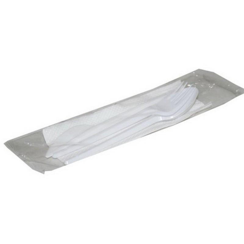 Набор одноразовых столовых приборов на 1 персону (4 предмета, 50 наборов в упаковке).<br>Набор подходит для холодных и горячих продуктов до +70°С. Изготовлен из качественного полистирола (PS6).<br>В набор входят:<br> — вилка,<br> столовая ложка,<br> нож,<br>салфетка. <br>Каждый набор находится в индивидуальной упаковке с удобной перфорацией для вскрытия пакета. В общей упаковке 50 наборов.