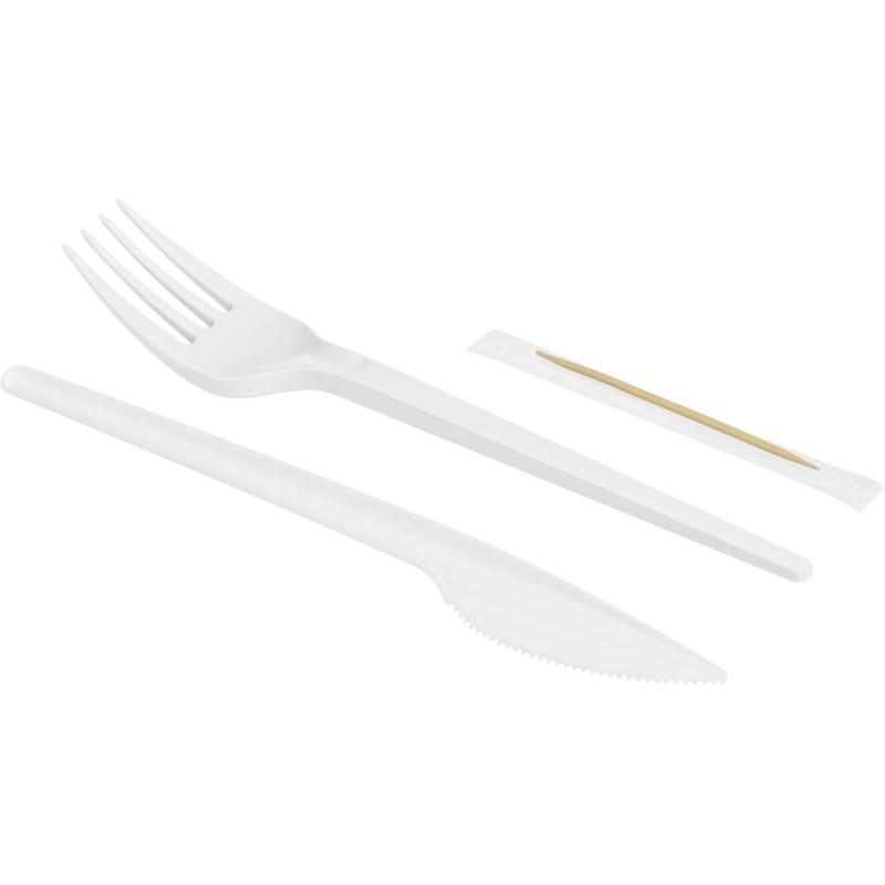 Набор столовых приборов Хорта на 1 персону (4 предмета, 300 наборов в упаковке). <br>Набор столовых приборов удобен для организации питания на выезде и для предприятий общепита, работающих со службами доставки. В набор входит: вилка белая 165 мм, нож белый 165 мм, зубочистка в индивидуальной упаковке, салфетка бумажная 24×24 см. <br>Приборы изготовлены из первичного пищевого полистирола, зубочистка из бамбука, салфетка из бумажной основы. Разрешен контакт с холодными и горячими до 75 градусов пищевыми продуктами. Срок годности не ограничен, при соблюдении условий хранения. <br>Каждый набор находится в индивидуальной упаковке с удобной перфорацией для вскрытия пакета. В общей упаковке 300 наборов. <br><br>Внимание! Товар поставляется в транспортном коробе (короба могут отличаться по форме и размеру).