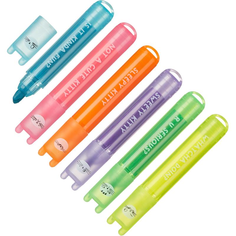 Набор мини-текстовыделителей M&G So Many Cats, предназначенных для маркировки текста на бумаге любой плотности. Текстовыделитель имеет компактный корпус из пластика. Ароматизированные чернила на водной основе. Текстовыделитель со скошенным стержнем позволяет проводить линии толщиной от 1 до 3 мм. В наборе 6 текстовыделителей неоновых цветов: зеленый, желтый, оранжевый, розовый, фиолетовый, синий.<b>Внимание! В наборе представлены мини-текстовыделители. Размер одного текстовыделителя 70x10 мм.</b>