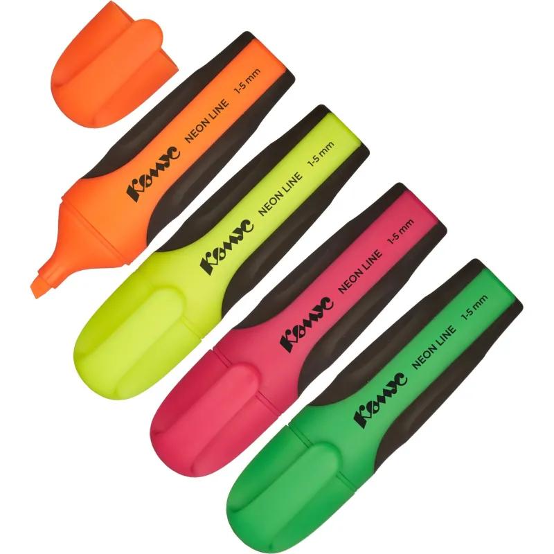 Набор текстовыделителей Комус Neon Line — это отличный выбор для любителей рисования маркерами. Текстовыделитель поможет выделять самое важное в документах или просто тексте, и Вы сможете обработать и не забыть больше полезной информации. Помимо стильного дизайна данный текстовыделитель отличает безупречное качество. Текстовыделитель обладает экономным расходом чернил. Светоустойчивые чернила на водной основе не выцветают даже на открытом солнце и не размазываются в процессе. Чернила не промокают бумагу. Текстовыделитель минимум 4 часа сохраняет работоспособность без колпачка — 100% концентрация на работе, а при закрытом колпачке полностью восстанавливает свои свойства. В наборе 4 цвета: желтый, зеленый, розовый, оранжевый. Цвет корпуса соответствует цвету чернил. Чернила не имеют запах. Маркер обладает плоской формой корпуса, резиновое покрытие черного цвета в зоне захвата обеспечивает комфортную эргономику и препятствует скольжению пальцев. Скошенный наконечник имеет толщину линии письма от 1 до 5 мм, что обеспечивает удобство при работе с текстом, напечатанным мелким шрифтом, или таблицами.