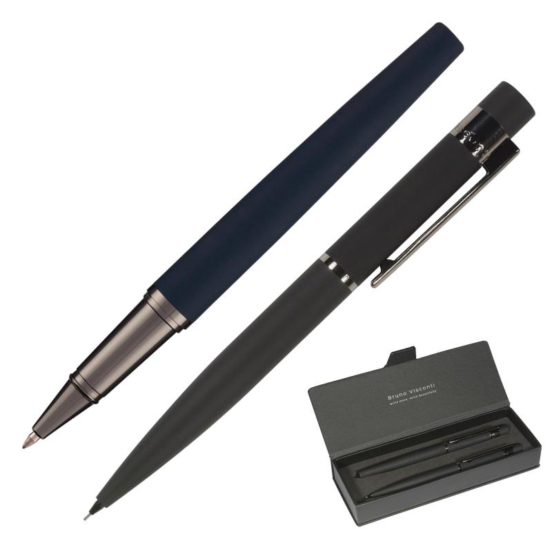 Набор в футляре из экокожи, состоящий из ручки роллера и каранаша механического.Роскошная ручка-роллер с синими чернилами из коллекции «Verona» от «Bruno Visconti».<br> Чернила на основе водорастворимого красителя.<br> Характерной чертой ручек коллекции «Verona» является увеличенный диаметр корпуса, но и он не вызывает дискомфорт в работе благодаря продуманной эргономичной форме и матовому покрытию. Наоборот, ручка смотрится респектабельно, а глянцевый наконечник и клип-зажим в контрасте с корпусом добавляют ручке нотку элегантности. Поэтому роллер «Verona» — отличный вариант бизнес-подарка и для мужчины, и для женщины!Механический карандаш «Verona» — аксессуар, призванный стать настоящим элементом стиля, подчеркнуть индивидуальность его владельца. Несмотря на увеличенный диаметр корпуса — 12 мм, он смотрится элегантно благодаря плавным линиям, эргономичному корпусу с покрытием Soft Touch. Контраст добавляют кольцо и клип из глянцевого темного металла. Сам стержень легко и бесперебойно выдвигается за счет мягкого поворотного механизма подачи, производитель которого гарантирует долгий срок эксплуатации. Отличный вариант для повседневной работы, а в наборе с подарочной ручкой или роллером «Verona» — вариант для корпоративного подарка!