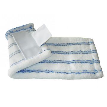 Насадка МОП для швабры-флаундера (плоской) ЭкоКоллекция микрофибра 40×11 см белая/синяя<br><br>Насадка МОП из микрофибры предназначена для профессиональной сухой и влажной уборки. Прямоугольная форма размером 40×11 см (с учётом прострочки 45×15 см) позволяет очищать большие участки пола за один проход. Ткань выполнена из особо прочной микрофибры с мягкими абразивными вставками, которые эффективно удаляют загрязнения без повреждения покрытия. Материал выдерживает до 100 циклов стирки при температуре 90 градусов, сохраняя форму и свойства.<br><br>Крепление через карманы и уши обеспечивает надёжную фиксацию насадки на основании швабры и совместимость с разными видами флаундеров. Вес изделия составляет 120 г, что делает его удобным в работе. Бело-синяя расцветка дополняется цветовой маркировкой в виде вставок разных цветов, что облегчает организацию уборки по стандартам ХАССП и позволяет разграничивать зоны применения.