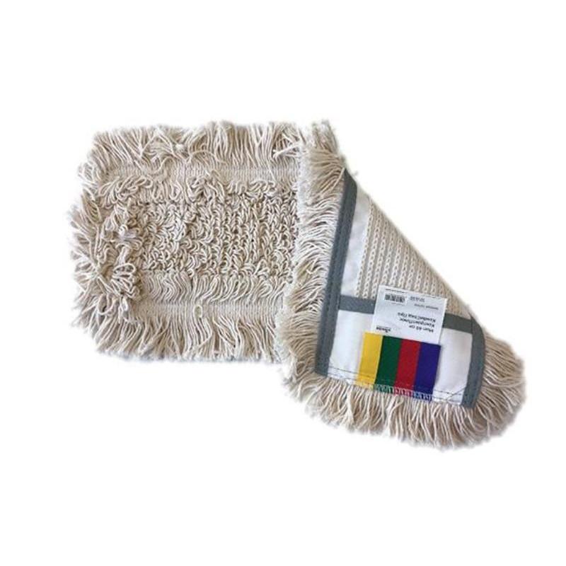 Насадка МОП для швабры-флаундера (плоской) Vileda Professional КонтрактПлюс КомбиСпид Про хлопок 43×15 см белая<br><br>Насадка МОП из хлопка предназначена для профессиональной уборки помещений с повышенной нагрузкой. Она имеет прямоугольную форму размером 43×15 см и крепится к держателю с помощью карманов, обеспечивая плотное прилегание. Хлопковые нити хорошо впитывают воду и удерживают загрязнения в большом объёме, что делает изделие подходящим для уборки кухонь, санузлов, входных зон, а также мастерских, автосалонов и складов. Петельчатая конструкция облегчает скольжение по полу, удерживает мусор внутри петель и помогает разрыхлять загрязнения.<br><br>Вес изделия составляет 165 г, материал рабочей поверхности — 95% хлопок и 5% прочие волокна. Прочная основа, двойная прошивка и качественный тафтинг предотвращают скатывание и распускание нитей, увеличивая срок службы. Дополнительный объём нитей по периметру помогает собирать мусор в труднодоступных местах. Насадка снабжена четырёхцветной кодировкой для предотвращения перекрёстных загрязнений. Она совместима с системой КомбиСпид Про и подходит для использования с тележками, вертикальными и роликовыми отжимами.