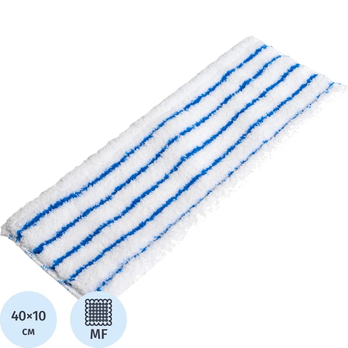 Насадка МОП Росмоп микрофибра 40×10 см белая/синяя<br><br>Насадка МОП из микрофибры предназначена для универсальной уборки полов и других гладких поверхностей. Подходит для сухой и влажной уборки, обеспечивая высокое качество очистки благодаря способности впитывать влагу до 600% от собственного веса. Прямоугольная форма рабочей части размером 40×10 см позволяет эффективно обрабатывать большие участки за один проход.<br>Насадка крепится в карманы швабры-флаундера, что обеспечивает быстрый монтаж и надёжную фиксацию. Белый цвет с синими полосами помогает разграничивать зоны применения, предотвращая перекрёстное загрязнение.