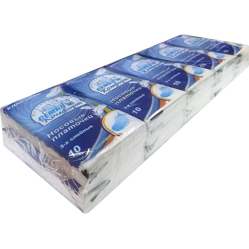 Белые <nobr>3-слойные</nobr> бумажные платочки Семья и Комфорт без аромата будут особенно востребованы в межсезонье, когда риск простудных заболеваний увеличивается в несколько раз. Платочки изготавливают из 100% целлюлозы. Данное средство гигиены обладает достаточной прочностью.<BR><BR>Размер платочка: 19×20 см.<BR><BR>Цена указана за 10 пачек по 10 платков.