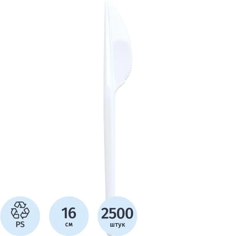 Нож одноразовый пластиковый белый 160 мм (2500 штук в упаковке) <br><br>Нож изготовлен из высококачественного полистирола, безопасного для здоровья человека. Лёгкий и прочный, без острых краёв и заусенцев. Подходит для использования как на предприятиях общепита, так и в домашних условиях.<br>Ножи упакованы в полиэтиленовый пакет по 100 штук. В общей упаковке 2500 шт. <br><br>Внимание! Товар поставляется в транспортном коробе.