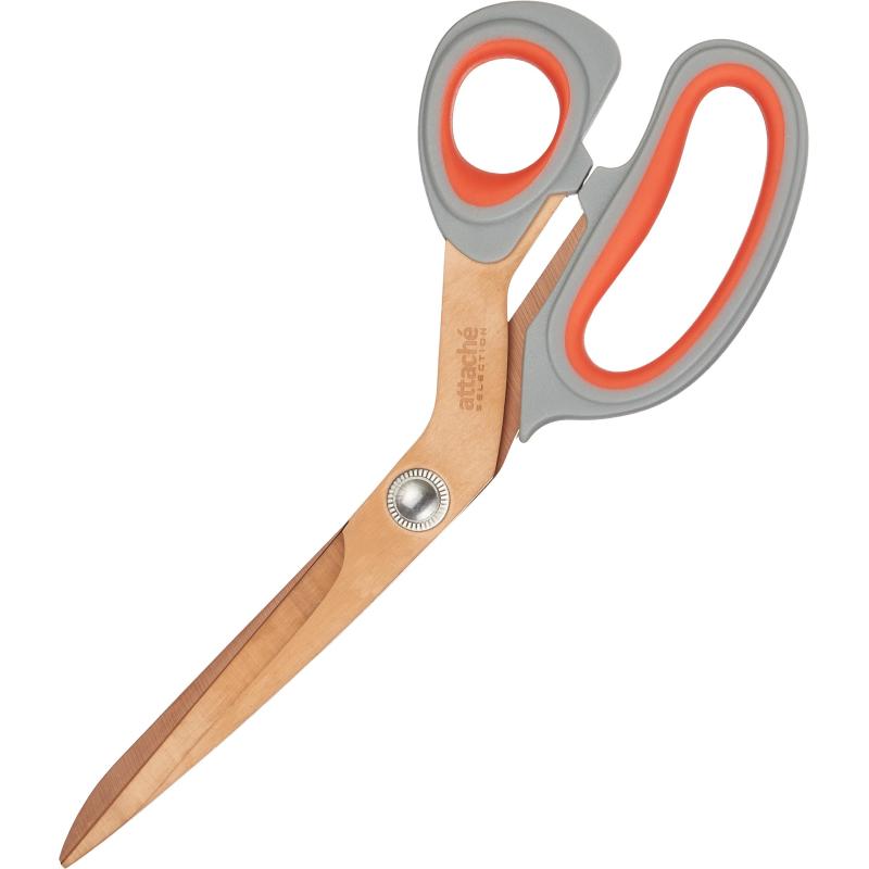 Ножницы Attache selection Energy, покрытие Titanium coffe. Изготовлены из высококачественной нержавеющей стали, толщина стали 3 мм. <BR>Эргономичные ручки. <BR>Цвет ручек — серый с оранжевым, длина 220 мм. <BR>Трехсторонняя заточка лезвий.