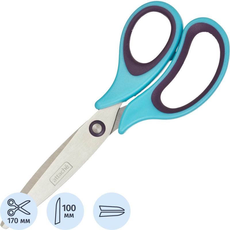 Ножницы Attache Town изготовлены из высококачественной нержавеющей стали. Толщина стали 1,8 мм. <BR>Длина лезвия 97 мм. <BR>Двухсторонняя заточка лезвий.<BR>Общая длина 170 мм. <BR>Эргономичные ручки. <BR>Цвет ручек — фиолетовый с голубым.