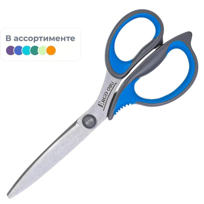 <p>Ножницы канцелярские бренда Deli универсального назначения — один из необходимых помощников как дома, так и в офисе при работе с бумагой и другими материалами. Лезвия изготовлены из нержавеющей стали, с возможностью двухсторонней заточки. Пластиковые ручки эргономичной формы снабжены прорезиненной вставкой для удобства пользования. Длина лезвий: 110 мм. Длина ножниц: 170 мм. Форма лезвий: тупоконечные. Вид колец: разные.<br />Товар поставляется в нескольких вариантах цвета (без возможности выбора).</p>