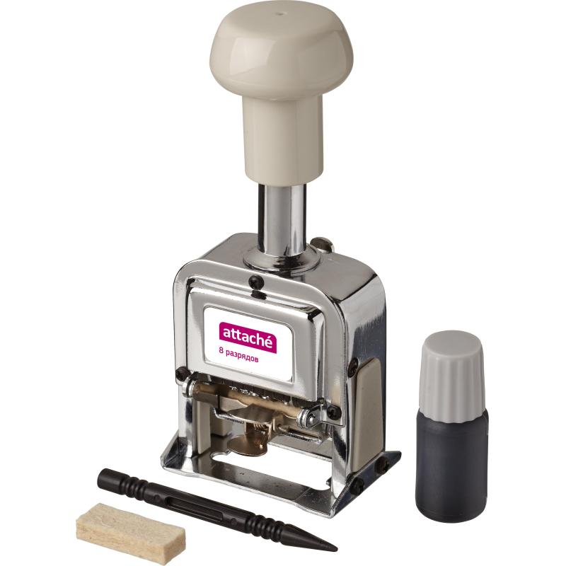 Нумератор автоматический Attache 8-и разрядный, размер шрифта 4,8 мм. Металлический корпус. При нажатии на ручку нумератора на бумаге появляется оттиск с номером. При повторном нажатии номер автоматически увеличивается на единицу. Нумератор имеет возможность фиксироваться на 2,3,4,6 и 12 нажатий прежде чем он провернется на 1 цифру далее. В комплект входит штемпельная подушка и черная краска. Пробела нет. Сменная подушка артикул 892698. Внимание! Возможно использование красок только на спиртовой и масляных основах. Обычные штемпельные краски на металле скатывается, и оттиск получается размазанным. Краски на масляных и спиртовых основах пропитывают тонкую бумагу насквозь.