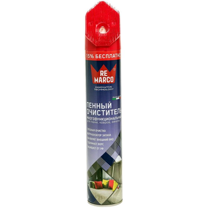 Очиститель для ткани Re Marco 750 мл<br><br>Аэрозоль — профессиональный очиститель загрязнений тканевой и виниловой обивки салона автомобиля, а также ковровых покрытий. Густая пена глубоко проникает в ткань, в ворс и волокна, очищая на всю глубину проникновения. Быстро и эффективно удаляет любые виды загрязнений обивки салона и ковров: грязь, жир, чернила и шоколад, мгновенно высыхая и оставляя приятный запах.<br><br>Сфера применения: применяется для очистки тканевой и виниловой обивки салона автомобиля, а также ковровых покрытий. <br><br>Для борьбы с особенно стойкими застарелыми загрязнениями предусмотрена мягкая щетка. Содержит специальный нейтрализатор запахов, который в отличие от традиционных освежителей не заглушает, а поглощает их.<br><br>Отличительными особенностями являются:<br>• Борьба с запахами на молекулярном уровне: разрушает источник, а не временно заглушает «отдушкой».<br>• Защита от УФ-лучей и обновление внешнего вида изделия.<br>• Подходит для применений в быту (ковровые покрытия, мягкая мебель и т.п.).<br><br>Внешний вид и/или характеристики товара могут быть изменены производителем в соответствии с производственным процессом.