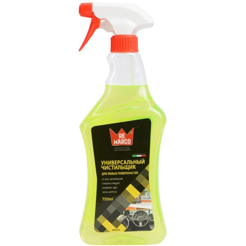 Очиститель универсальный Re Marco Чистильщик жидкость 750 мл<br><br>Сфера применения: используется для чистки и дезинфекции деталей салона автомобиля из экокожи, пластика, винила, металла, стекла и дерева. Также может применяться для очистки линолеума, ламината, лакированных и эмалированных поверхностей (ванна, санузел). <br>Безопасен для ЛКП.<br>Удаляет жир, следы жевательной резинки, скотча, маркера; растворяет остатки клея, масла с механических частей; помогает в борьбе с плесенью и грибком. Освежает цвета, удаляет даже стойкие пятна. Беспенный состав, не требующий обязательного ополаскивания обработанной поверхности.<br>Отличительными особенностями являются:<br>• очищение любых твердых поверхностей (за исключением тканевых и бумажных) как в автомобиле, так и в быту;<br>• подходит для применения в моющих пылесосах.<br><br>Внешний вид и/или характеристики товара могут быть изменены производителем в соответствии с производственным процессом.