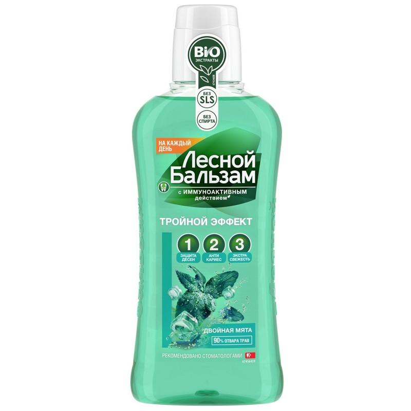 Ополаскиватель для полости рта Лесной бальзам Мята и лесные травы 400 мл<br><br>Профилактический ополаскиватель Лесной бальзам Тройной эффект экстрасвежесть надолго подарит вам ощущение свежести дыхания и обеспечит максимальную защиту от неприятного запаха изо рта в течение дня. Очищает до 100% полости рта, нейтрализует действие патогенных бактерий в полости рта и значимо снижает скорость образования налёта. Ополаскиватель обладает выраженным мятным вкусом и сочетает в себе сразу 3 действия, позволяя достичь максимальной защиты всей полости рта: 1. Укрепляет дёсны благодаря запатентованной формуле на отваре трав (90% отвара трав), усиленной соком алоэ и экстрактом молодых листьев чёрной смородины. 2. Защищает от кариеса и укрепляет эмаль за счёт минерального комплекса с фтором. 3. Дарит длительное ощущение свежести и защищает от образования неприятного запаха изо рта за счёт усиленной формулы с натуральной мятой.<br>Клинически доказано: ежедневное использование серии тройной эффект (зубная паста ополаскиватель) в 3 раза снижает образование налёта на зубах — основной причины кариеса и проблем дёсен.<br>Рекомендации.<br>— Рекомендован в качестве профилактического средства для укрепления дёсен и против неприятного запаха изо рта (при галитозе).<br>— Использовать после каждой чистки зубов, а также после еды для очищения межзубных промежутков.<br>— Не требуется полоскать после использования водой.<br>— Подходит для использования в ирригаторе.<br>— Подходит для использования в период беременности и лактации.<br>Состав: Aqua, Glycerin, PEG-40 Hydrogenated Castor Oil, Abies Sibirica Leaf Extract, Achillea Millefolium Extract, Chamomilla Recutita (Matricaria) Flower Extract, Chelidonium Majus Extract, Hypericum Perforatum Flower/Leaf/Stem Extract, Mentha Piperita (Peppermint) Leaf Extract (Экстракт мяты перечной), Urtica Dioica (Nettle) Leaf Powder, Aroma, Cetylpyridinium Chloride, Citric Acid, Disodium EDTA, Glycine Soja (Soybean) Oil, Phenoxyethanol, Sodium Benzoate, Sodium Fluoride, Sodium Hydroxide, Sodium Saccharin, Benzyl Alcohol, Limonene, CI 19140, CI 42090.<br>Способ применения: Наполните колпачок ополаскивателем. Тщательно прополощите полость рта в течение 30 секунд. Использовать после еды, до и после чистки зубов не реже двух раз в день.<br>Объём: 400 мл.