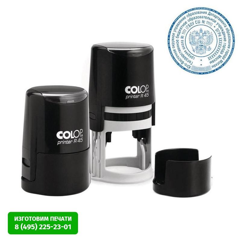 Надежный пластиковый корпус с автоматическим окрашиванием текста. Нижняя крышка позволяет блокировать корпус в сложенном компактном виде, защищает клише. Используется для основной или дополнительной печати организации, гербовой печати. В комплекте: оснастка, нижняя крышка, синяя сменная подушка E/R45 синяя (арт. 44729), демпферный слой (двусторонний скотч). (аналог 46045).<br>Внимание! Все сменные штемпельные подушки, которыми комплектуется продукция Colop, заправлены краской Noris (Германия) на водной основе с добавлением глицерина и предназначены для проставления оттисков на бумагу и пористые поверхности. При необходимости проставления оттисков спиртсодержащей краской при помощи автоматической оснастки, стандартную подушку, идущую в комплекте, необходимо заменить на специальную совместимую со спиртосодержащими красками, во избежание затвердевания подушечного материала. Заказывается индивидуально.