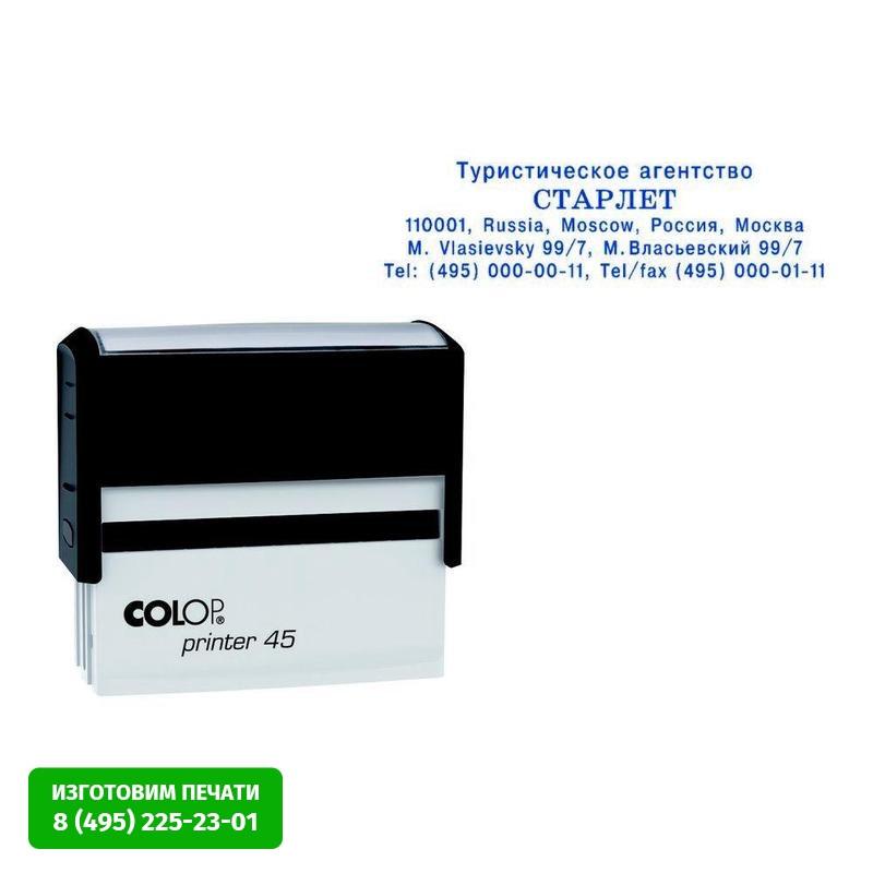 <b>Для заказа печати или штампа с клише Вашего дизайна отправьте запрос на электронную почту reklama@komus.net или позвоните по телефону (495)685-95-10. </b></p> Надежный пластиковый корпус классического дизайна с автоматическим окрашиванием текста. Текстовые пластины прямоугольной формы под изготовление клише для информационных, маркировочных, адресных штампов . В комплекте: оснастка, сменная подушка синего цвета E/45, демпферный слой (двусторонний скотч) для крепления клише. Размер 25×82 мм.<br><br>Внимание! Все сменные штемпельные подушки, которыми комплектуется продукция Colop, заправлены краской Noris (Германия) на водной основе с добавлением глицерина и предназначены для проставления оттисков на бумагу и пористые поверхности. При необходимости проставления оттисков спиртсодержащей краской при помощи автоматической оснастки, стандартную подушку, идущую в комплекте, необходимо заменить на специальную совместимую со спиртосодержащими красками, во избежание затвердевания подушечного материала. Заказывается индивидуально.