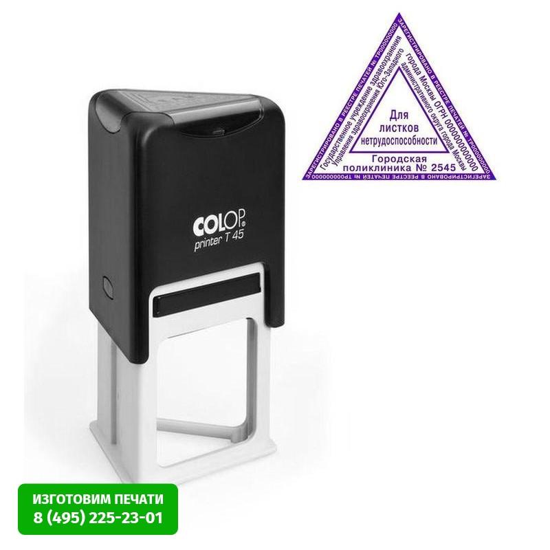 <b> <b>Для заказа печати или штампа с клише Вашего дизайна отправьте запрос на электронную почту reklama@komus.net или позвоните по телефону (495)685-95-10. </b></p> Первая в мире, запатентованная оснастка треугольной формы</b></p> <br />Надежный пластиковый корпус с автоматическим окрашиванием текста<br />Используется под изготовление клише для поликлиник, больниц и др. (заказывается отдельно).<br />В комплекте: оснастка, сменная подушка синего цвета E/Т45 (арт. 219021), демпферный слой (двусторонний скотч) для крепления клише.<br />Размер 45×45×45 мм.<br><br>Внимание! Все сменные штемпельные подушки, которыми комплектуется продукция Colop, заправлены краской Noris (Германия) на водной основе с добавлением глицерина и предназначены для проставления оттисков на бумагу и пористые поверхности. При необходимости проставления оттисков спиртсодержащей краской при помощи автоматической оснастки, стандартную подушку, идущую в комплекте, необходимо заменить на специальную совместимую со спиртосодержащими красками, во избежание затвердевания подушечного материала. Заказывается индивидуально.