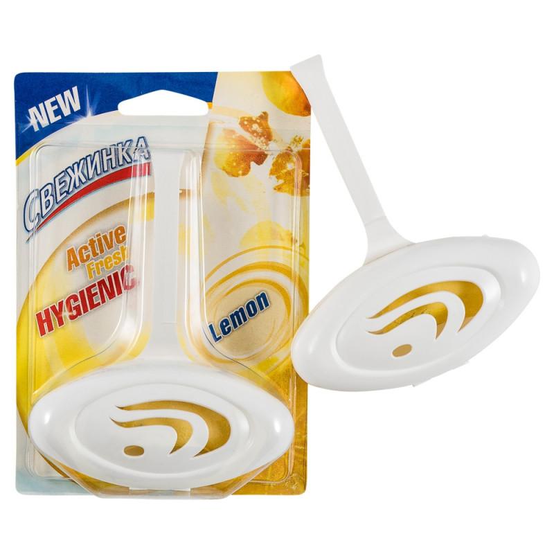 Блок для унитаза гигиенический Свежинка Лимон. Безопасность, эталонное качество, удобство эксплуатации — главные критерии средства по уходу за туалетом. Гигиенический блок для унитаза Свежинка Лимон моющее и освежающее одновременно. Имеет длительное действие. Помогает предотвратить появление известкового налета, водного и мочевого камня. <b>Способ применения</b>: вынуть из упаковки, повесить на край унитаза в пределах досягаемости водной струи. <b>Меры предосторожности</b>: избегайте попадания в глаза и на кожу. При контакте с глазами немедленно промыть их большим количеством воды.<b>Состав</b>: соли органических и неорганических кислот >50%, анионные ПАВ >15%, но <30%, неионогенные ПАВ <5%,ароматизирующие компоненты <5%, краситель <1%. <b>Условия хранения</b>: хранить средство в недоступном для детей и домашних животных месте. <b>Срок годности</b>: 2 года от даты изготовления.